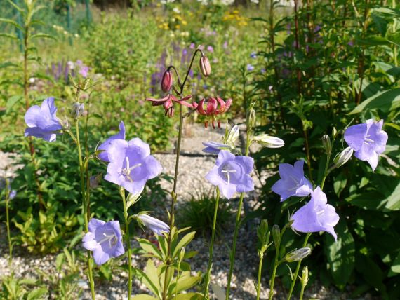 | Campanula persicifolia | 80 | heimische Wildstaude, großblumig, im Frühsommer blühend, versamt in Lücken ohne lästig zu werden |