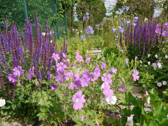 Eine farbenfrohe und heitere Mischung für sonnige bis halbschattige Standorte mit frischgrünem Laub und guter Bodendeckung. Zur Hauptblütezeit dominieren rosa und blaue Töne von Storchschnabel und Salbei das Erscheinungsbild. Den Herbstaspekt sichern die Gerüststauden Sesleria und Frikart´s Aster.